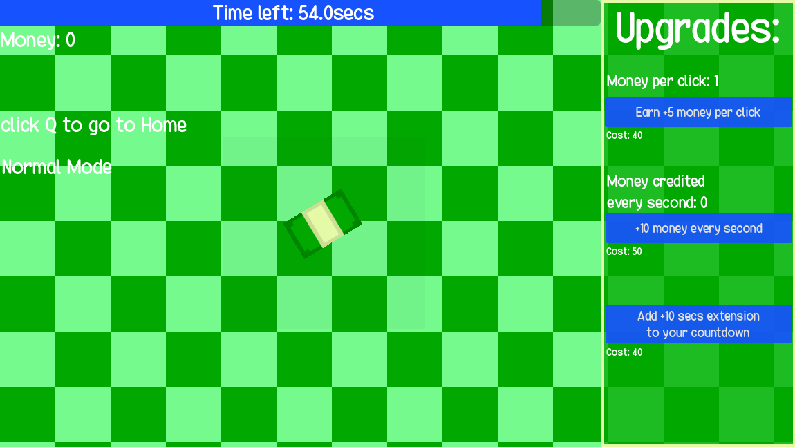 This is a simple Clicker Game, where you have to click the cash to earn money, and you have to do all this in under 1 minute, while buying upgrades to increase the income.
